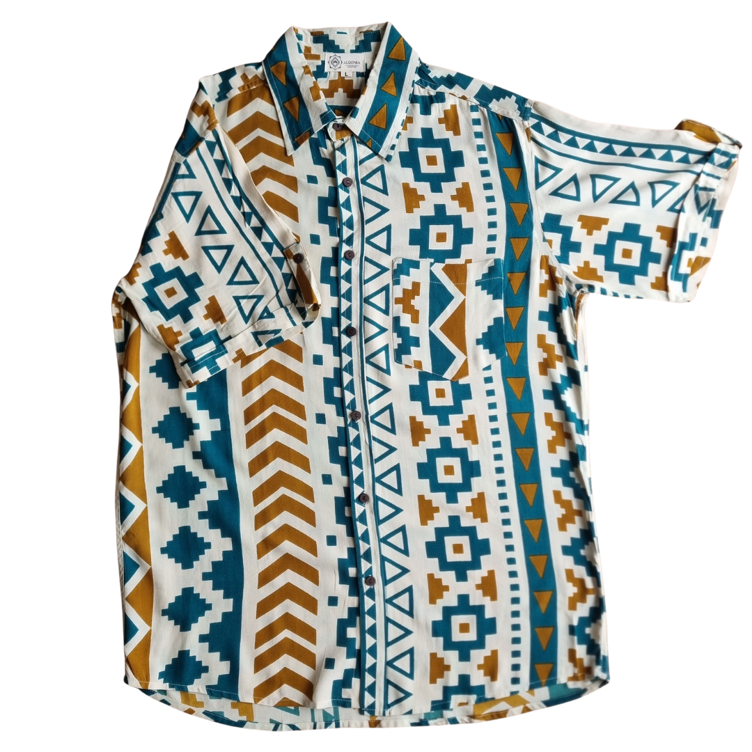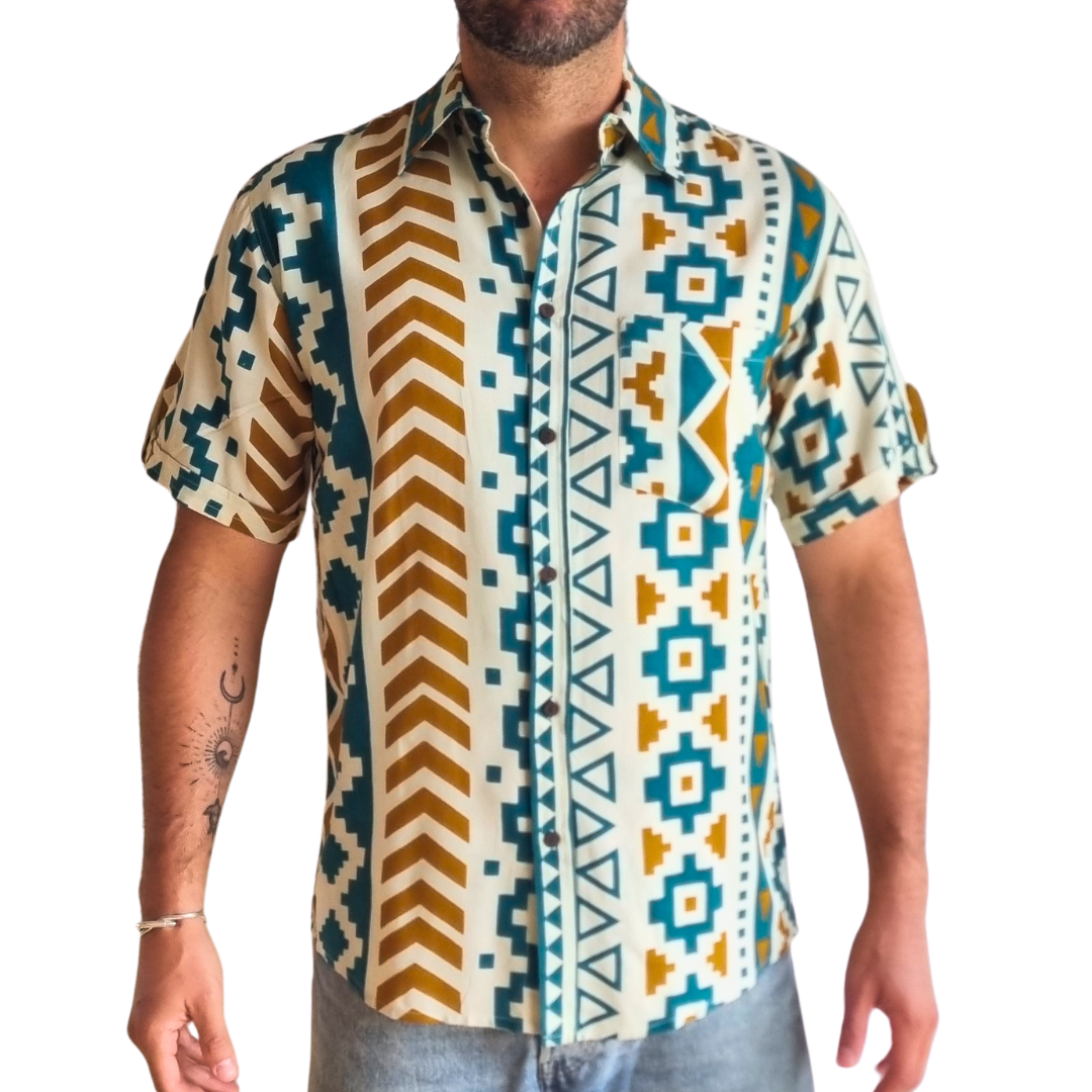 Camisa de Rayón con estampado geométrico inspirado en los caminos andinos.