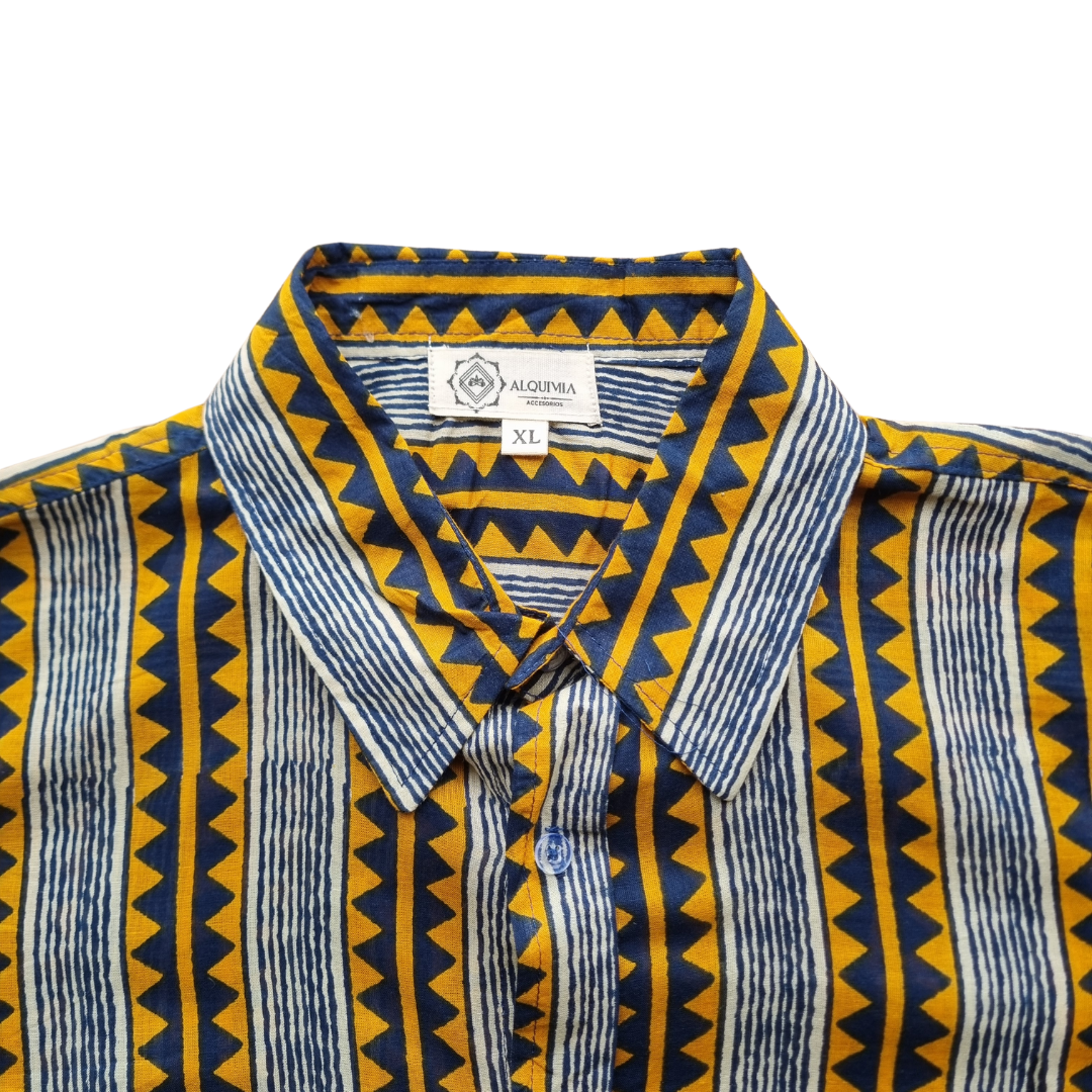 Camisa de rayón de corte clásico con patrón de rayas verticales y triángulos. Inspirada en la arena volcánica oscura y el reflejo dorado del sol poniente sobre el agua cristalina de Porto Pim, Faial, Azores. El contraste vibrante evoca un momento de calma en la costa atlántica, ideal para un estilo contemporáneo y distintivo.