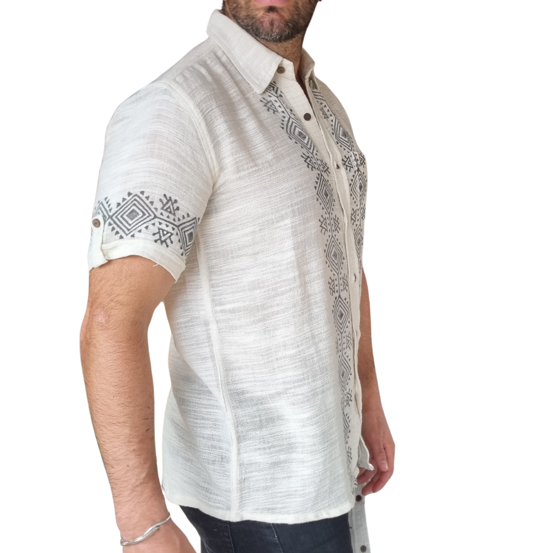 Camisa de algodón inspirada en las aguas cristalinas y la vegetación tropical de la playa de Anse Source d'Argent, Seychelles. Confeccionada en algodón natural de tono blanco, su diseño desestructurado y detalles minimalistas evocan elegancia orgánica y serenidad costera.