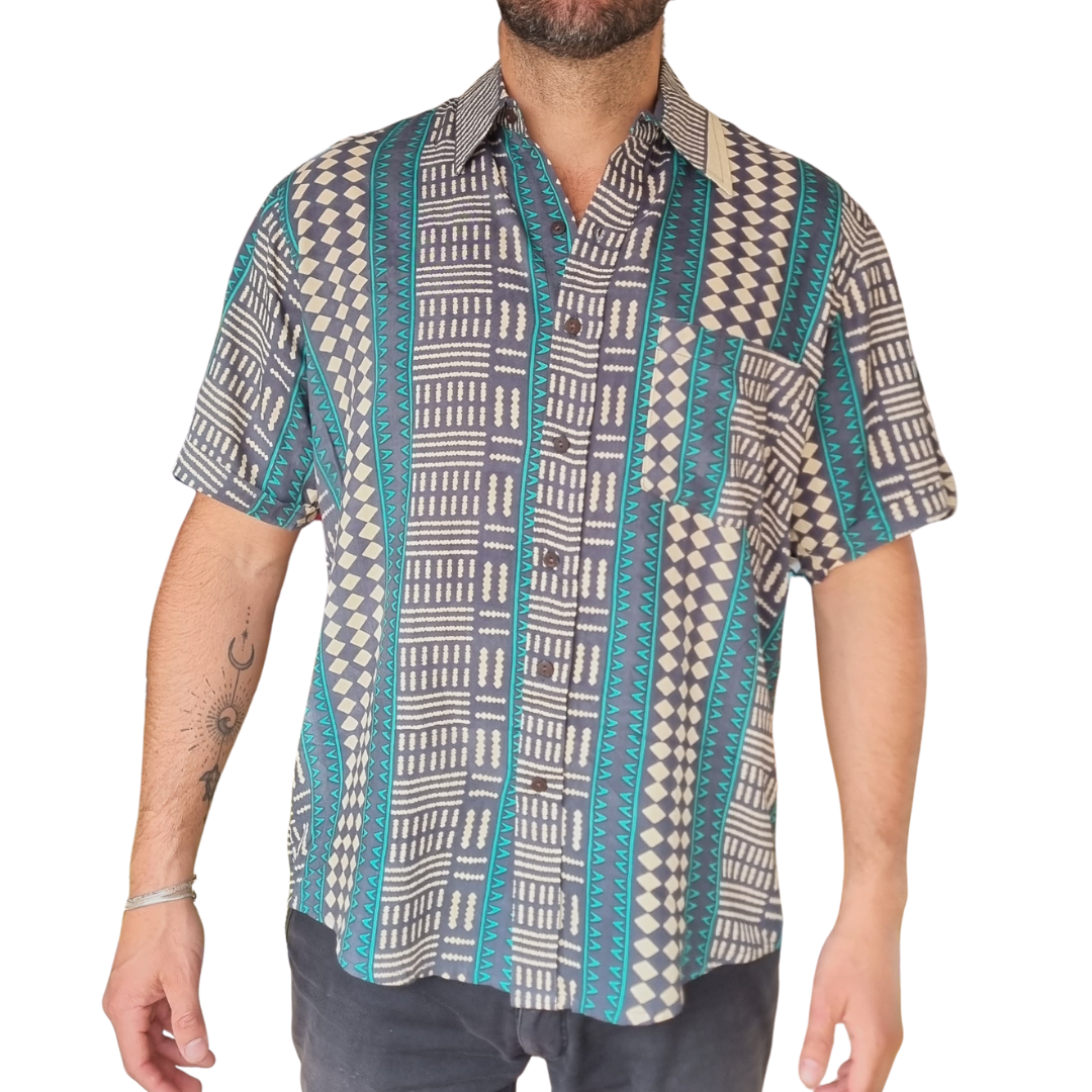Camisa de rayón de corte tradicional con patrón geométrico intrincado. Inspirada en la serenidad profunda del Océano Pacífico y el brillo de la arena blanca bajo la sombra de las palmeras en Playa Sámara, Costa Rica. Los detalles turquesa añaden un toque de la exuberante vegetación costera, resultando en un estilo sofisticado y tropical.