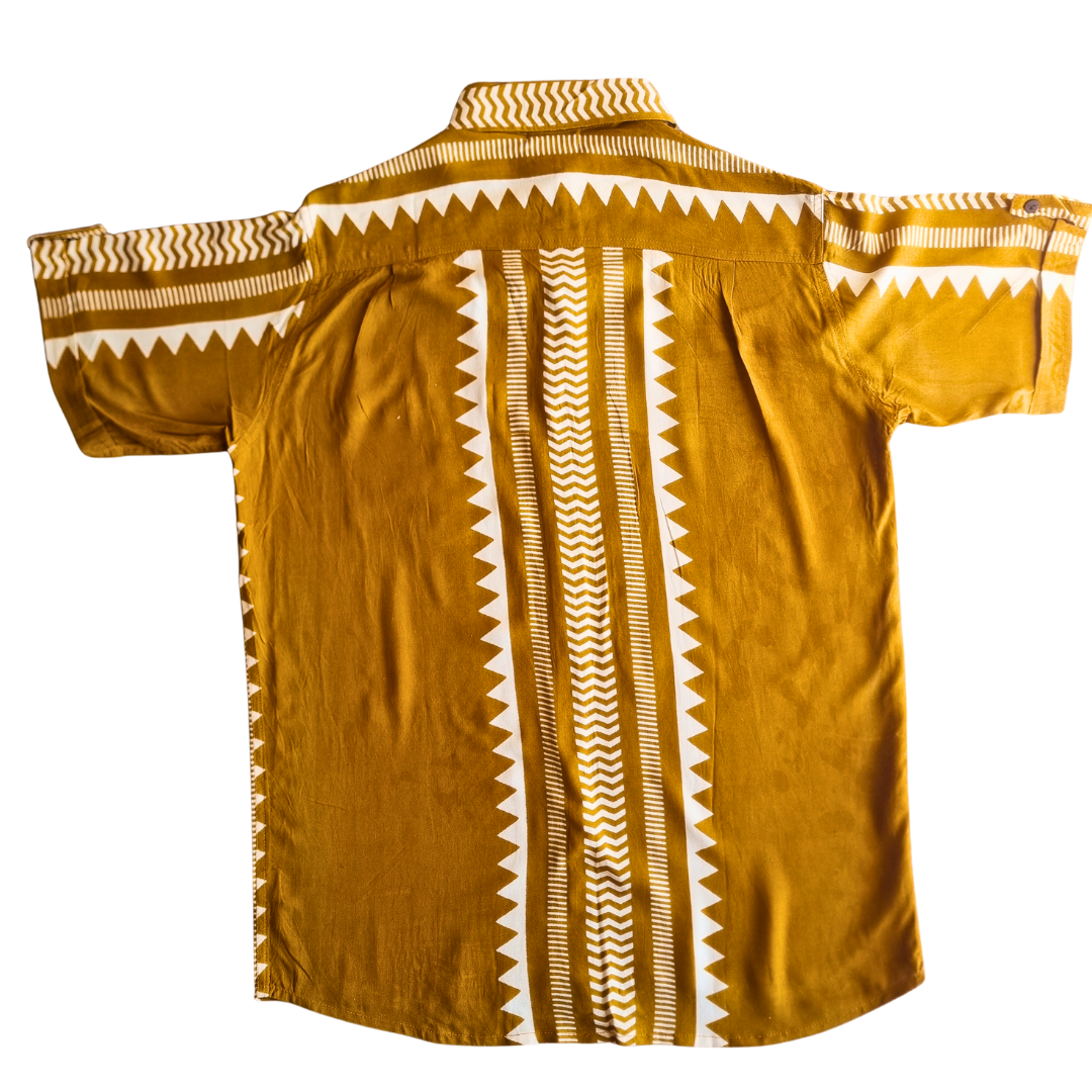 Camisa de Rayón con tonos dorados con diseño geométrico inspirado en los paisajes del desierto. Cálida, poderosa y libre. Una prenda que transmite energía natural y estilo auténtico.