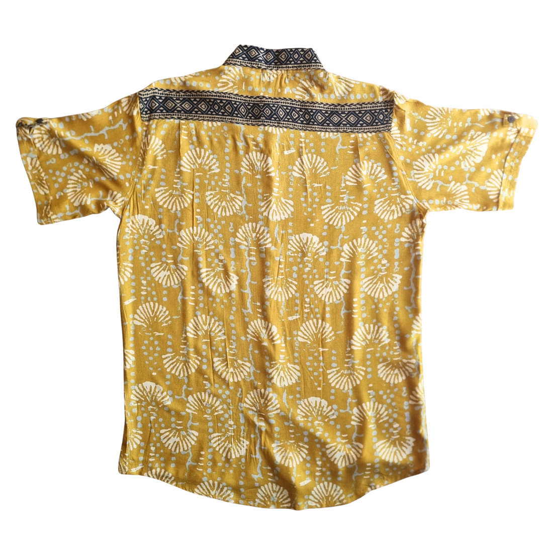 Camisa de Rayón color arena con inspiración artesanal y detalles de coral.